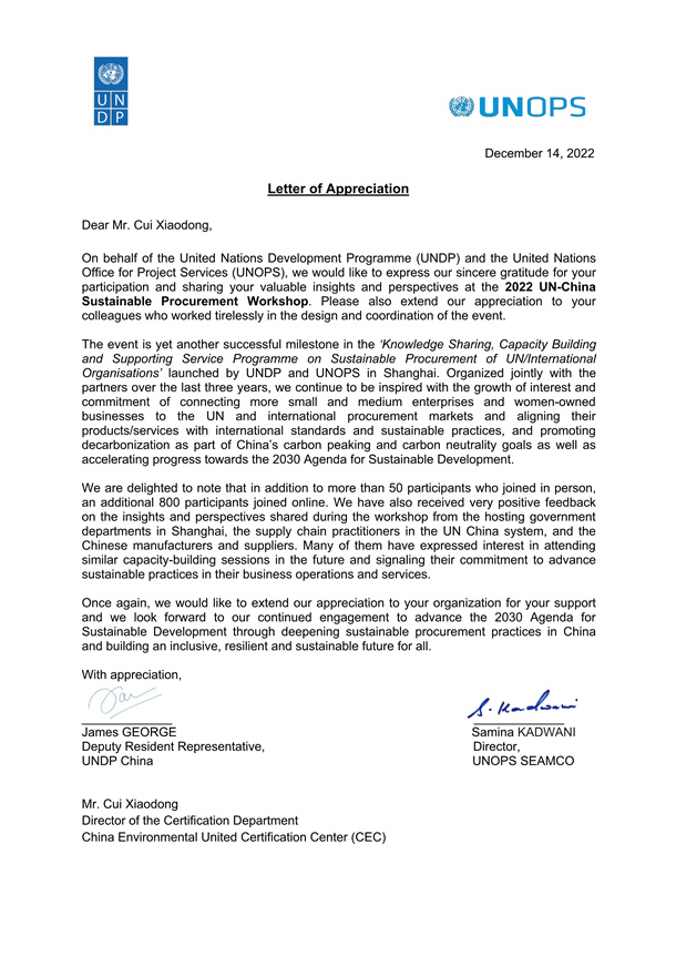 近日,聯合國開發計劃署和聯合國項目事務署向中環聯合認證中心發來感謝信,對中環聯合認證中心代表在2022年聯合國中國可持續采購研討會的精彩分享表示感謝,并希望以此為契機,繼續深化合作交流,共同推進2030年可持續發展議程,建設更包容、 強韌和可持續的未來。