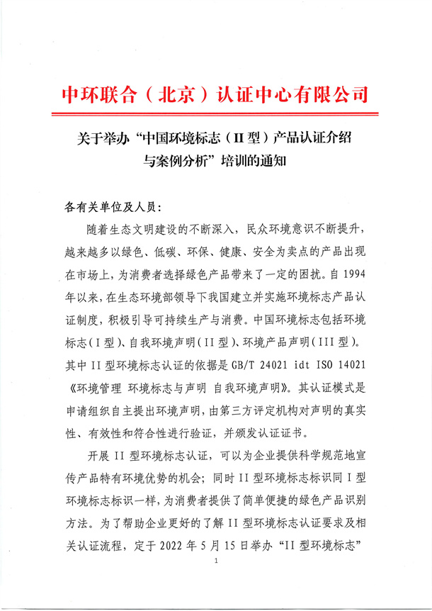關于舉辦 “中國環境標志 (Ⅱ 型 )產品認證介紹與案例分析” 培訓的通知