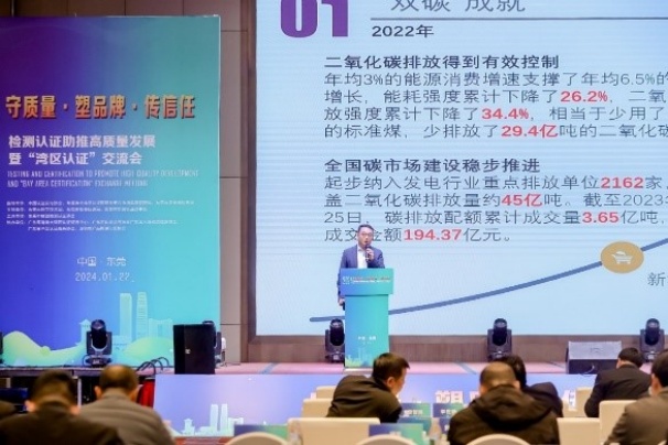 1月22日,“守質量·塑品牌·傳信任”檢測認證助推高質量發展暨“灣區認證”交流會在東莞舉辦。中環聯合(北京)認證中心有限公司(以下簡稱“中環聯合”)受邀參加,陳軼群副總經理在會上做了“構建雙碳認證制度,強化雙碳質量基礎設施建設”的主旨演講。